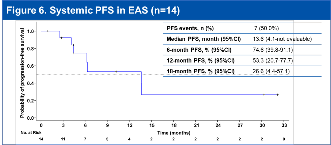 ●截至2023年3月24日,共有17例患者入組,其中14例患者接受恩沙替尼治療并有≥1次的療效評估,可用于療效/安全分析?;颊咧形荒挲g為55歲,71.4%為女性。1例(7%)患者為恩沙替尼一線治療,其余13例(93%)患者為恩沙替尼二線治療(前線為克唑替尼治療)。中位隨訪時間為13.9個月(范圍,4.4-47.5)。其中6例(42.9%)患者依然在組治療。