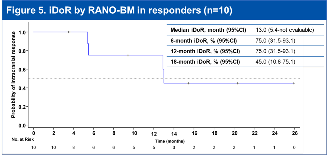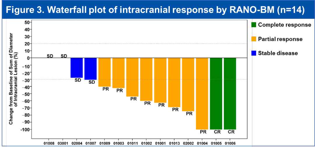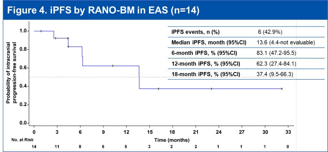 ●療效:主要終點(diǎn)指標(biāo)iORR為71.4%(95%CI, 41.9%-91.6%),2例(14.3%)完全緩解(CR),8例(57.1%)部分緩解(PR)。4例患者疾病穩(wěn)定(SD),iDCR為100%(95%CI, 76.8%-100.0% )?;?例iPFS事件數(shù),中位iPFS達(dá)到13.6個月(95%CI, 4.4-not evaluable [NE] )。10例腫瘤緩解患者中,中位iDoR為13.0個月(95%CI, 5.4-NE)。中位全身性PFS為13.6個月,1年P(guān)FS率為53.3%??偵嫫谏形闯墒?。MMSE未發(fā)生變化(相對基線≤3分改變)。中位CSF/血漿藥物濃度比為1.52%。